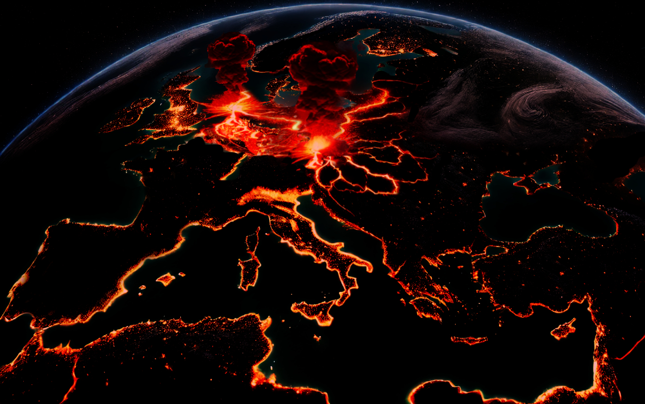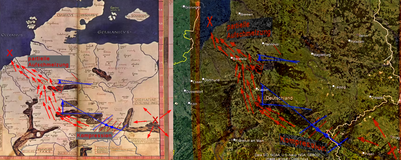Im Vergleich der mittelalterlichen Karte mit aktuellen Satellitenaufnahmen könnte es auf der Suche nach weiteren Indizien auch gleichsam tatsächlich so erscheinen, als könnte es sich bei der kreisförmigen Struktur zwischen Osnabrück bis Cloppenburg (siehe Samtgemeinde Artland) ebenfalls um einen jüngeren Einschlagkrater handeln (vgl. auch Bramscher Pluton), zu welchem sich die gesamte Topografie Mitteldeutschlands hin orientiert, mit dem Harz und insbesondere mit dem Thüringer Wald, die wie verflüssigt (ggf. als [unterirdische)] Teilschmelze) folglich nach Nord-Westen hin gezogen oder verschoben worden sein könnten, entlang des Teutoburger Waldes und des Wiehengebirges – als hier eine mögliche Kraterstruktur eventuell mit nachlaufendem Gesteinsmaterial verfüllt worden ist. Der Thüringer Wald hätte dabei im Gesamten womöglich eine Veränderung der Streichrichtung (Streichrotation) von etwa 45 Grad im Uhrzeigersinn erfahren. Ebenso wie auch das Erzgebirge nun eine solche Rotation im Vergleich zur historischen Kartendarstellung aufzuweisen scheint (→ öffne Skizze 1 in neuem Tab, bzw. für ein besseres Verständnis, die mittels KI (künstliche Intelligenz) generierte, aber stärker übertriebene Darstellung eines solches Szenarios in Skizze 2→. *) wichtige Anmerkung: Es handelt sich hierbei lediglich um eine künstlerische Phantasie-Darstellung, mit der kein Anspruch auf Genauigkeit verbunden ist und welche die beschriebene Situation kurz nach einem möglichen Impaktereignis nur sehr beispielhaft und wohl sehr übertrieben aufzeigt.